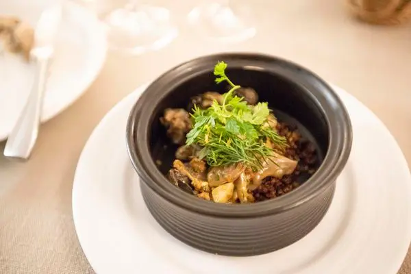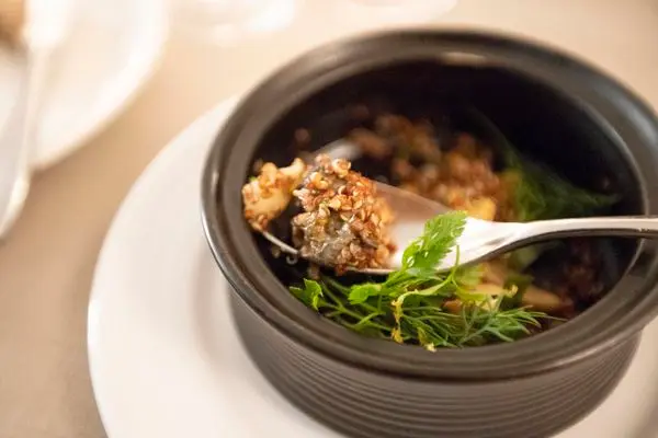 這田螺底下搭配西班牙臘腸、藜麥,還有個比較想不到的食材荸薺,