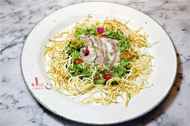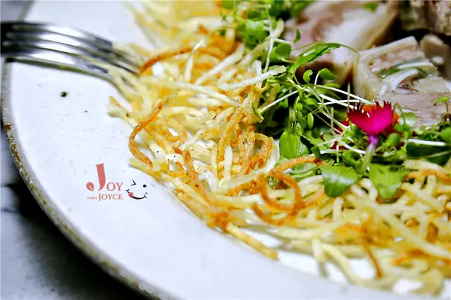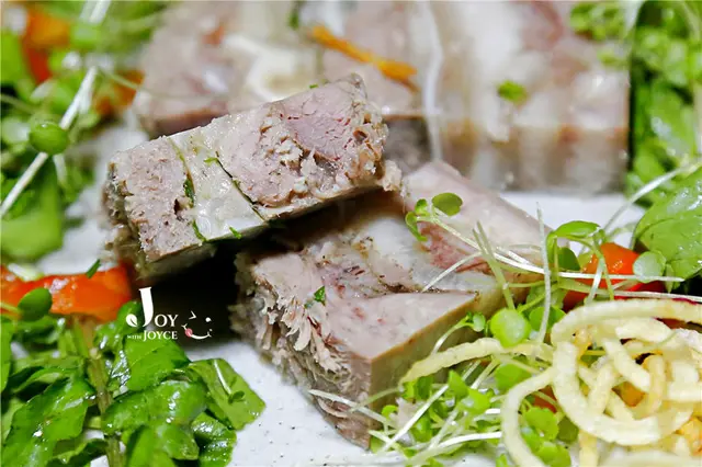 冰涼豬肉凍有著滿滿膠質,口感處理的很細膩、多變,吃起來Q彈,時而鬆軟,時而吃到燉煮軟爛的筋更加爽脆,最喜歡那濃郁的迷人香草味兒!