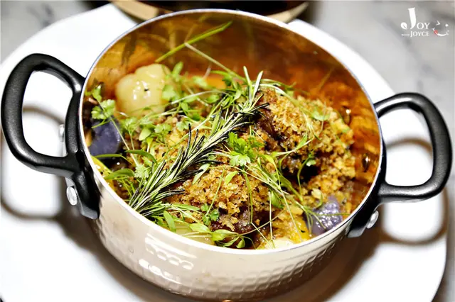 使用仿土雞腿肉,以Bourguignon紅酒加上部分冬季蔬菜和香料一起燉煮再放入銅鍋盛裝,灑上炒過的麵包粉,一上桌香氣四溢。