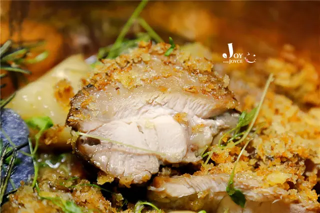 雞肉軟中紮實,完全不過柴、不過硬,吃起來香鹹入味,非常好吃!配上上頭炒過的麵包粉增添整體口感上的酥脆,尾韻是優雅的迷迭香氣息,與紅酒搭配相互契合,真是一大享受呀!