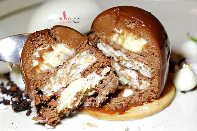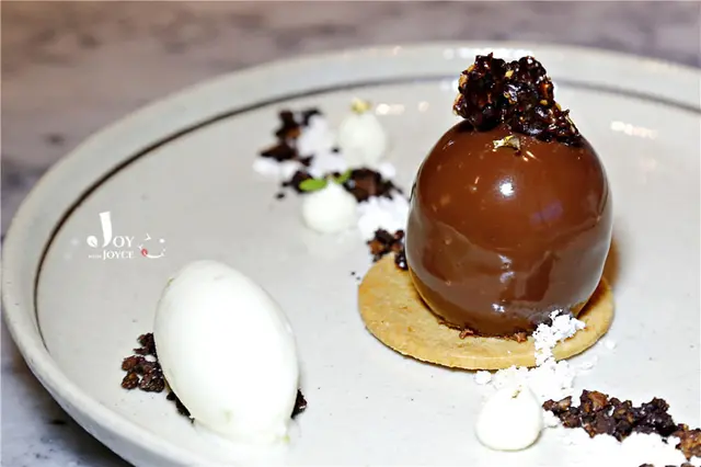 充滿神秘氣息的星球鏡面造型!選用頂級法芙娜巧克力製作呀的慕斯,搭配鳳梨椰子雪酪。