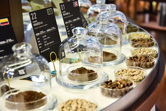 展示各國產地咖啡豆同時有生豆及烘焙後,在玻璃罩中的咖啡粉則是在挑選想要的豆子時,