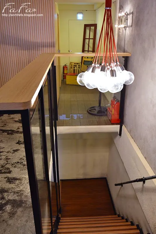 昏黃色調從一樓繼續延伸至二樓,又搭配木頭桌水管桌角,有些椅子則是鐵桶改裝而成,
