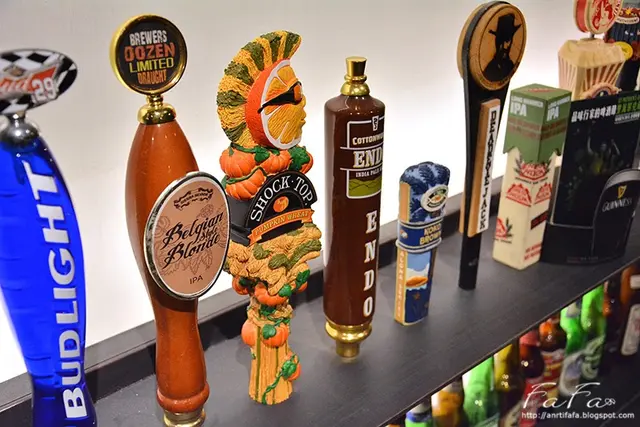 本來還覺得空間剛好,人一多椅子都拉開才顯得走道好小,走動時免不了會碰到他人掛在椅上的外套。在台北很少有機會看到店家展示生啤把手(Tap Handles),尤其是各種款式造型的,有些逗趣有些可愛,看得很想也跟著收藏。