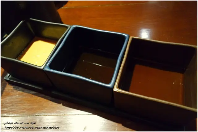 沾醬有3種 吃菜盤時只沾了點最左邊的味噌醬 雖然湯頭很清淡不過煮到最後不沾醬也夠(鹹)味