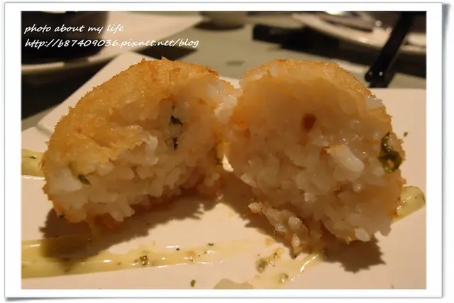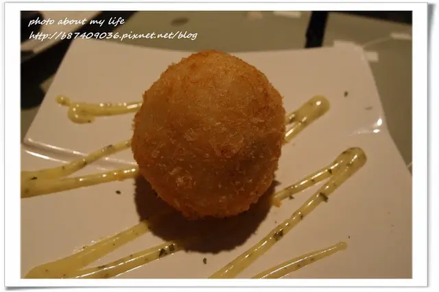 咬開酥脆炸衣裡頭是調味過的飯糰 雖然米飯黏了點/鮭魚香氣淡了點 不過微微鹹味再沾點芥末美奶滋 好吃!