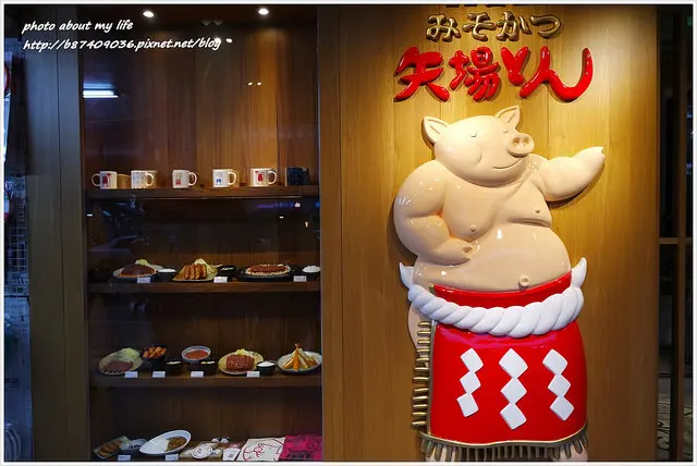 櫥窗裡製作精美的sample看起來好美味但最搶眼的是旁邊牆上仿彿說著來吃我歡迎光臨的相撲豬仔
