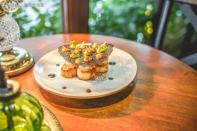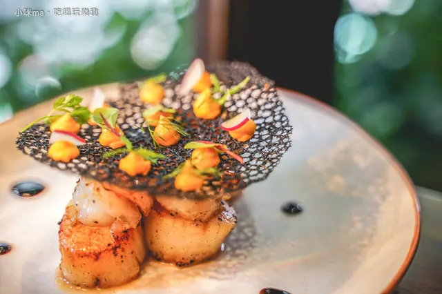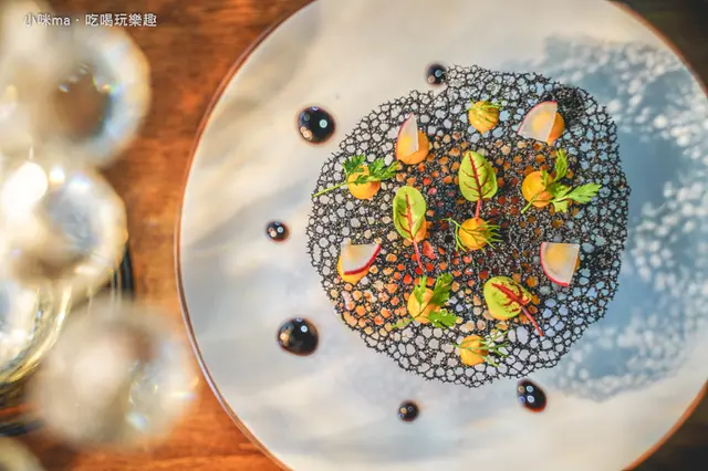 上面用墨魚薄餅點綴, 就像黑色蕾絲一樣帶點浪漫,點上仿蟹黃醬汁,是不是很華麗