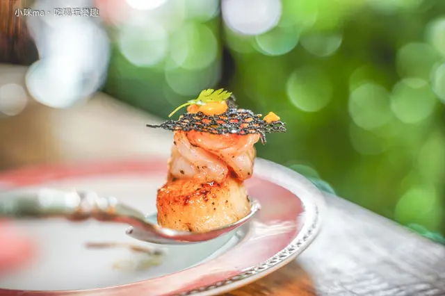 一上桌就看到彷彿珠寶盒般華麗的前菜,底下的干貝跟大蝦仁煎到焦香,碩大肥美讓人口水直流