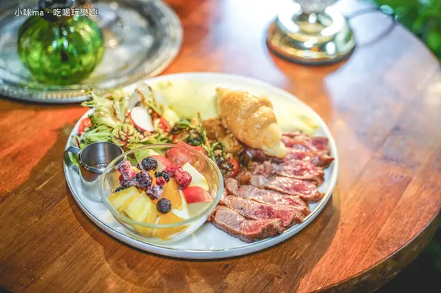 小娜點的早午餐份量也超大,生菜沙拉、土豆炒菇、手工麵包、法式蛋捲、牛排、優格水果,澎派度也是滿點