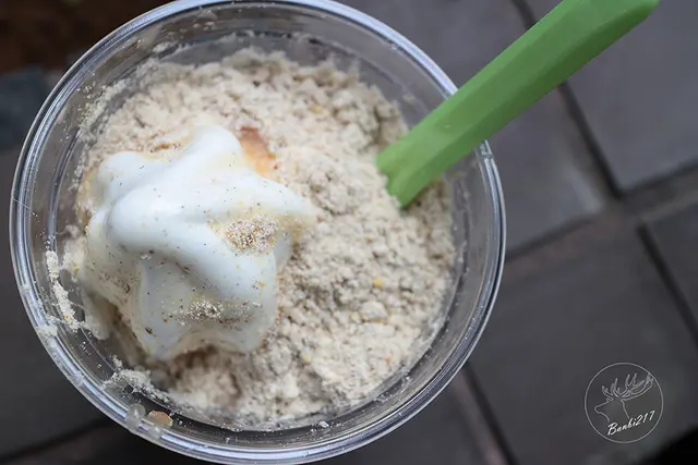 焦糖醬擠入杯子底層,接著加入霜淇淋,最後撒上混合穀粉。此穀粉的香氣十足有些蓋住底層的焦糖醬香氣,而穀粉的味道讓我想起日式的黃豆粉那樣的感覺,不過味道較沒那麼重且親和,這是我第二喜歡的口味。