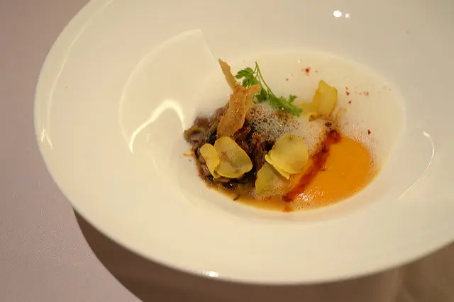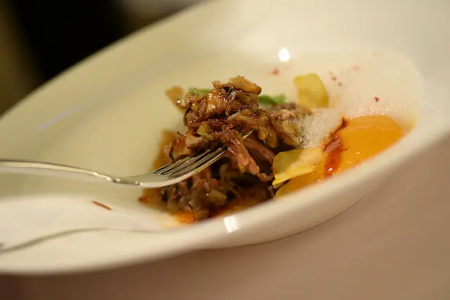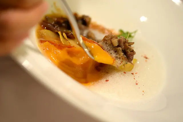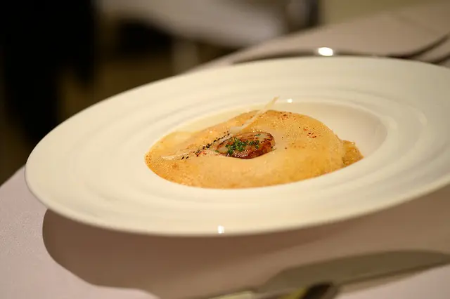 期待的主菜來了油封櫻桃鴨搭配南瓜卡布奇諾及栗子脆片