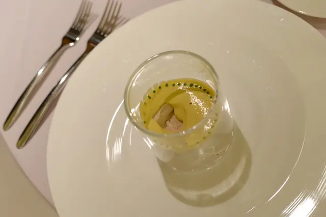 第一道 水果玉米泥襯鴨肝慕絲及雞湯凍
