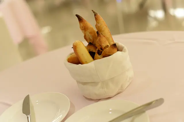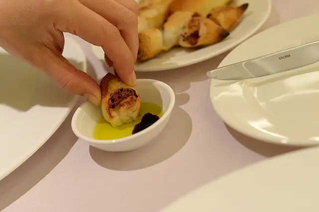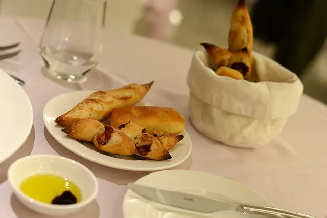連續兩道都是綿細潤滑的慕絲類,口感顯得無趣,加上這一道鹹了一點,吃點麵包吧!