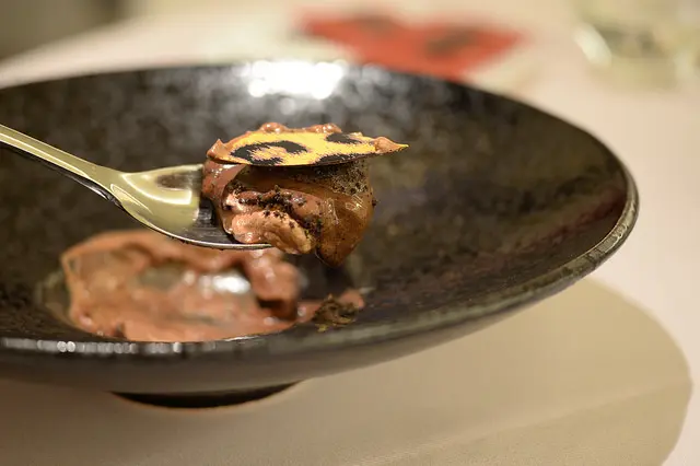 鴨肝只有薄薄的一層卻在玉米的香氣過後輕巧浮現明確不帶腥味的肝臟風味,