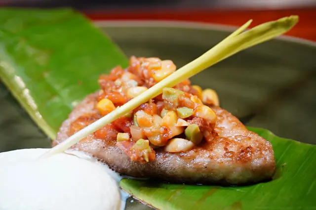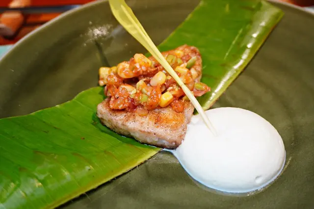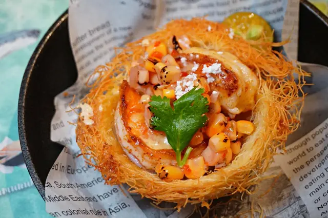搭配上直火燒過的火焰蝦, 再加上玉米、沙沙醬、等配料