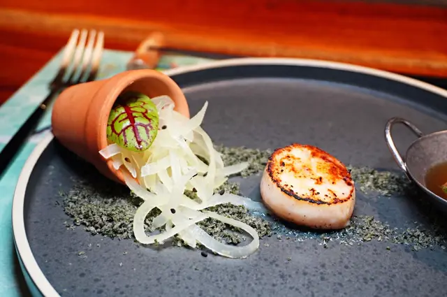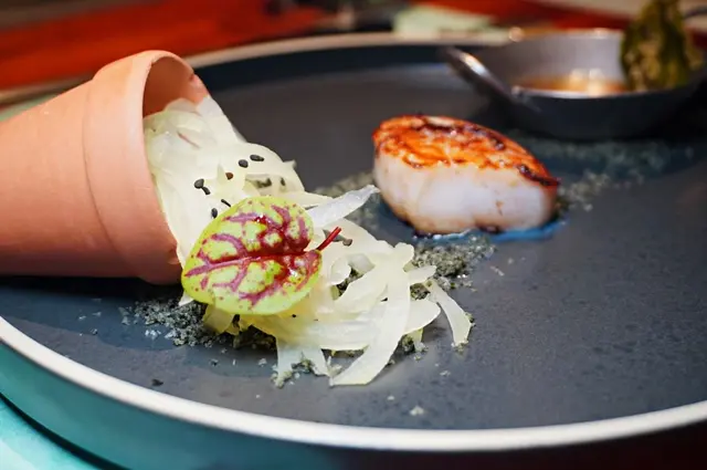 大顆北海道生食級干貝外層被煎的微焦, 裡頭保有軟嫩口感