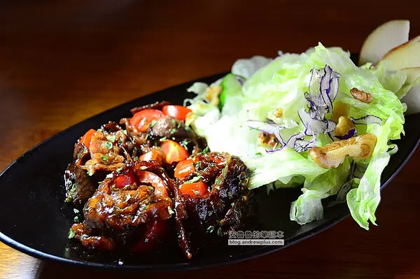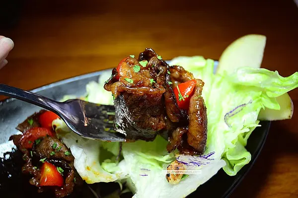 ▼肉片捲起來包裹著番茄擺放在盤子上,像是一朵朵盛開的花兒,外層塗上鹹甜醬汁的牛肉片故意煎得有點老,跟著番茄一起入口,一咬下去番茄在嘴裡面噴汁,肉片扎實的口感和多汁的番茄配合得剛剛好,在嘴裡形成很有層次的口感