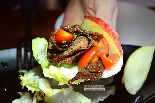 ▼拿起一片生菜,放上牛肉卷和蘋果切片,就像在吃韓式烤肉一樣,把他們捲起來一口往嘴裡塞,香甜多汁又有牛肉的甜味真是過癮