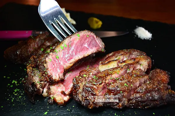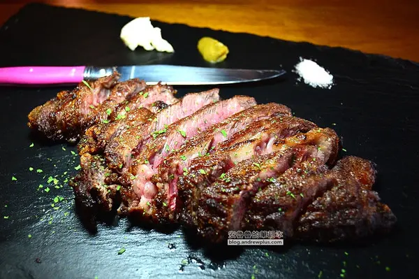 依店家建議三分熟,低溫烹調的牛肉內層帶著粉嫩的色澤,外層煎烤出接近全熟的部份,會帶著酥脆的口感有點像在吃炸排骨。佐料依照為玫瑰鹽、胡椒芥末、自製大蒜泡泡,可依喜好搭配食用