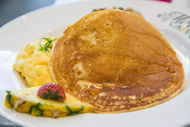 Moena Cafe以夏威夷鬆餅為主打,兒童餐附的是原味鬆餅,不是塗有奶霜或醬料的口味,但單吃這同樣的鬆餅體便覺得乾也無香氣,表現很普通,相比之下麥當勞早餐的鬆餅可能CP值與味道上較好。
