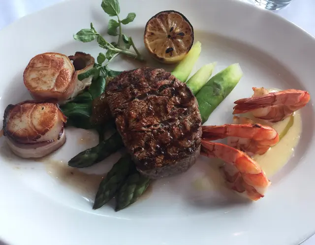 surf & turf---菲力牛排配烤蝦及香烤培根干貝😬