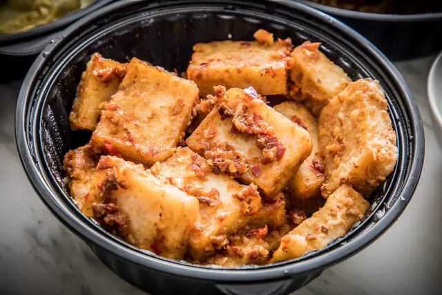 兔攜好運蝦醬彩頭糕,一般港式蘿蔔糕常見就是炒XO醬,NARA是炒蝦醬,蝦醬的味道更濃郁鹹香,蘿蔔糕本體也很軟嫩有彈性,入口還有蘿蔔甜味,然後這道完全不需要沾醬,直接吃就非常好吃!