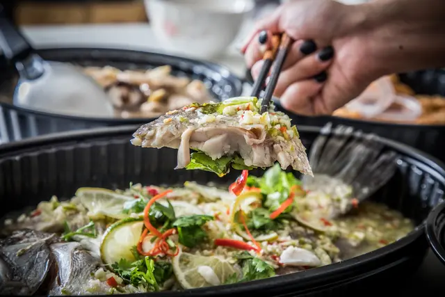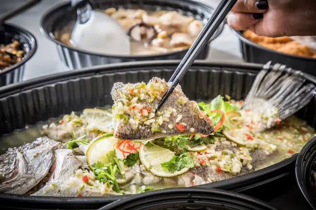 泰式檸檬魚,鱸魚真的超大一尾,而且肉質細緻又厚實,充滿檸檬清香,酸辣甘美的醬汁十分開胃!