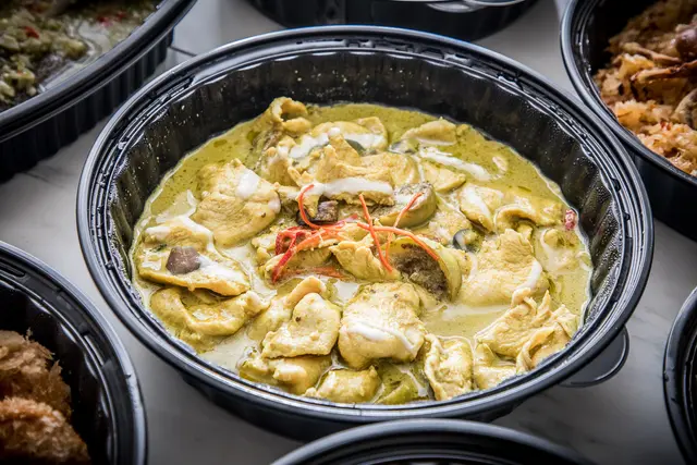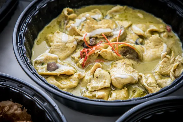 綠咖哩雞肉,我最喜歡的就是綠咖哩了, 因為綠咖哩是泰式咖哩中辣度比較高的,很下飯,而且帶有濃郁椰奶香醇滑順的口感,雞肉吃起來也超嫩超入味的!