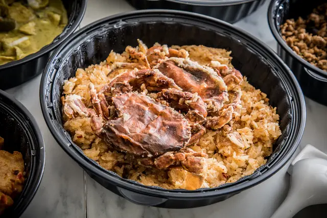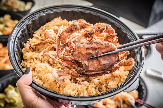 兔發橫財軟殼蟹XO醬米糕,霸氣十足的軟殼蟹直接擺兩隻!酥炸將軟殼蟹的風味水份都鎖在裡面,軟殼蟹的肉質相當飽滿,加上下面帶有微微辣度的鮮香有彈性的XO醬米糕,吃來精緻又有飽足感