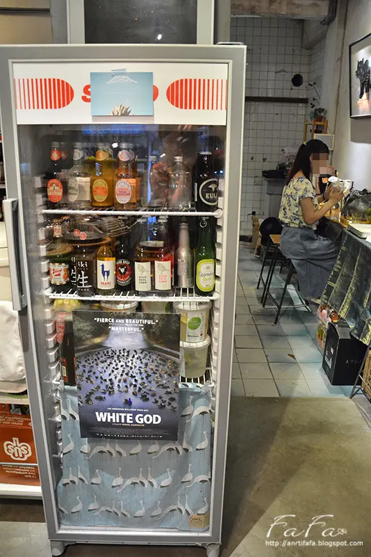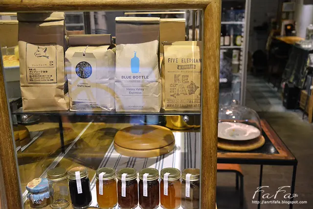 櫃台櫥櫃內擺放了來自其他國家的咖啡廳品牌之咖啡豆,