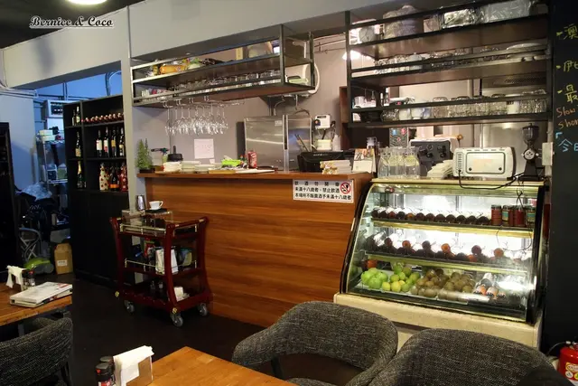 後方是果汁飲料吧!前面有檯小餐車裡面擺滿了充手沖咖啡的器具