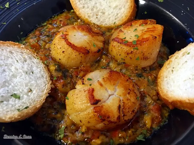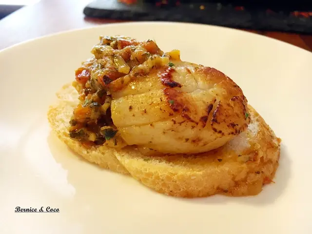 挖取一大匙的醬料放上一顆干貝佐法式麵包