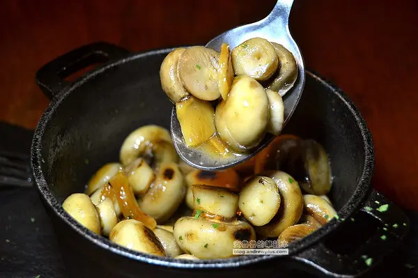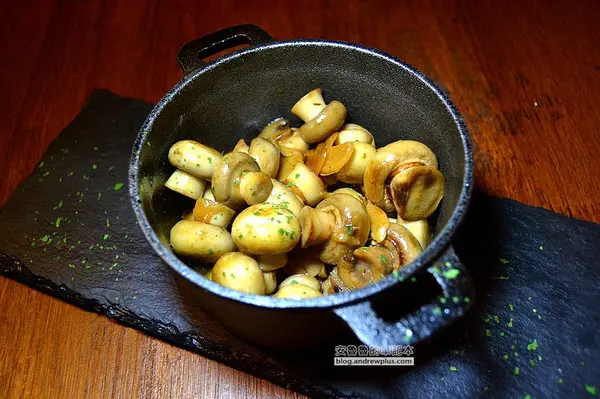 ▼蘑菇特有的香氣很多人都很喜愛,尤其是入口之後會在舌頭上打滑圓潤的感覺,咬下去會有點脆脆的口感,比較鹹的醬汁以及濃郁香氣的蒜片搭配,吃起來真是開胃!