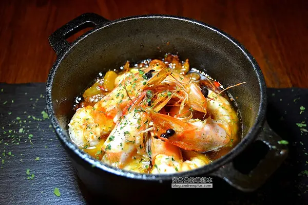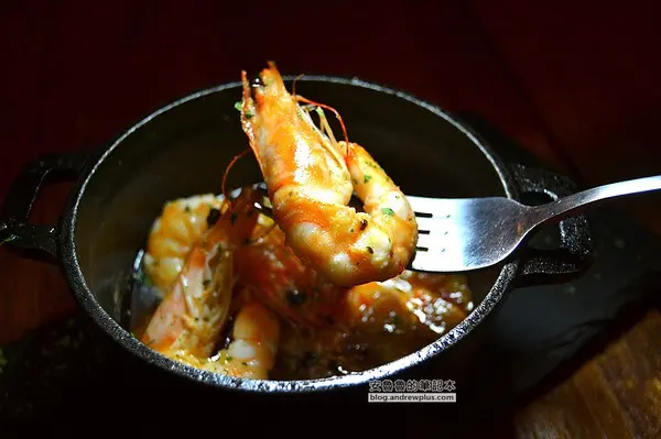 這一鍋剛上桌的時候,底層的橄欖油還在起泡熱滾中。去殼蝦肉鮮甜的味道比蒜味更明顯,整個蝦身雖然泡在橄欖油裡,吃起來卻依然覺得清爽,不過建議上桌後稍加攪拌,避免鐵鍋高溫持續加熱,肉質鹹度跟硬度增加