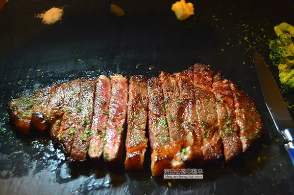 低溫烹調三分熟不帶血帶點筋,已經切成條狀外層帶著焦香,可依喜好佐海鹽/柚子胡椒/蒜味慕斯,配上海鹽提升甜味,喜愛帶點辣味刺激味蕾就不能錯過柚子胡椒,用蒜味慕斯代替常見的烤大蒜也很適合