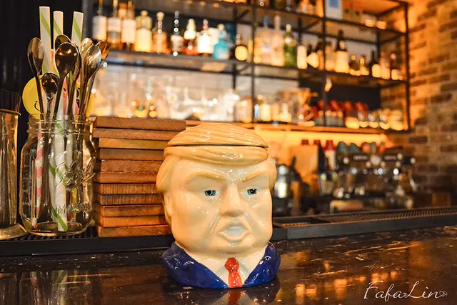 調酒吧台上Donald Trump瓷器是令人莞爾一笑的存在。當時不知道其用途是什麼,後來才知道有個調酒會使用這款容器裝盛。