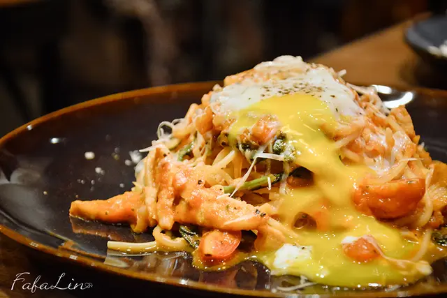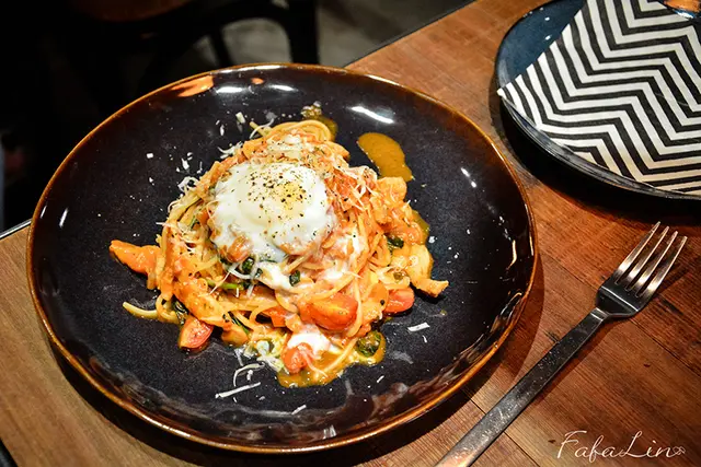松阪豬肉溫泉蛋蕃茄麵 Pan Fried Pork Pasta in Red Sauce NT$380
