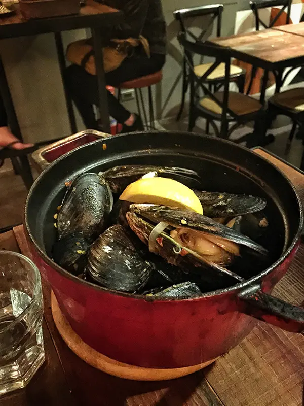 附上一訪時用手機拍攝的白酒淡菜鍋,滿滿一鍋由大約22公分的鑄鐵鍋裝,直接奉上,看起來相當氣派。其他口味還有蒜辣、青醬、泰式酸辣、台式三杯...等等,口味多樣化。