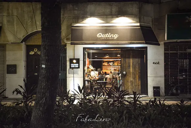 Outing Cafe所在位子藏身在社區住宅圈,隔著一條林蔭大道仁愛路就是國父紀念館。從捷運國父紀念館站2號出口步行約8分鐘左右。黑色雨棚沈穩的顏色延伸到招牌以及門框、桌椅,厚重刷色木門看來有些陳舊感,一眼看上便馬上萌生好奇心。當時在用餐時,不少路人過客都會停駐在玻璃窗前看呀看。