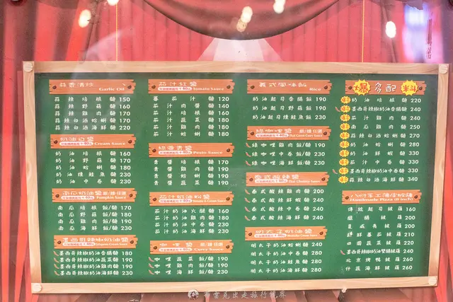 Parco義大利麵店菜單是用不同醬料來分項目,像是蒜香清炒、奶油白醬、南瓜奶油醬、墨西哥辣椒奶油醬、茄汁紅醬、綠蓉青醬、茄汁奶油粉醬、咖哩醬、綠咖哩醬、泰式酸辣醬、明太子奶油醬與XO醬,爆多配料就是配料加倍,雖然原本的就很多但爆料就會給更多,另外麵條有細麵、寬麵、貝殼麵、蝴蝶麵與斜管麵選擇,主餐加90元可升級套餐,加麵不加價,旁邊桌的媽媽就直接點加麵跟小小孩一起分著吃。