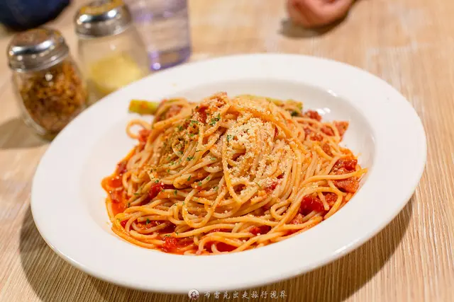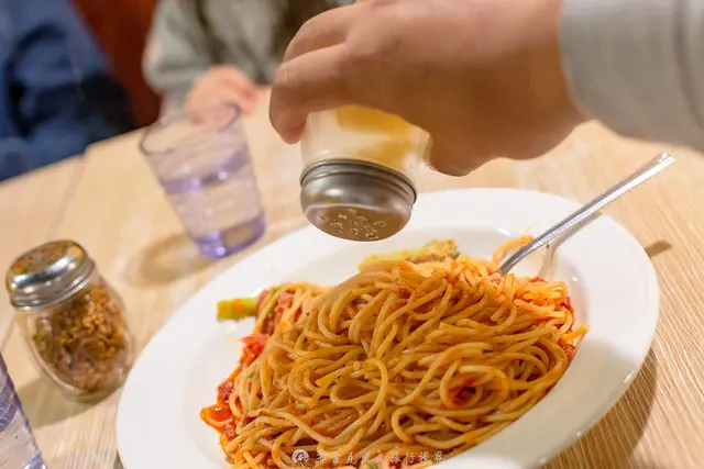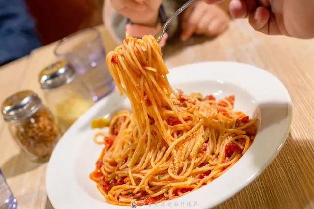 茄汁培根麵基上就是有加麵啦!份量上真的有夠多的啦,然後喜歡起司味道重一些的,那就起司粉下好下滿,茄汁的味道還蠻濃厚的,是帶有甜味的蕃茄香氣,培根的熟度也是很剛好,麵條熟度也很OK,不會太軟爛,收汁剛剛好,沒有太多湯湯水水感,算是中上等級的義大利麵。