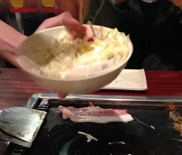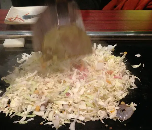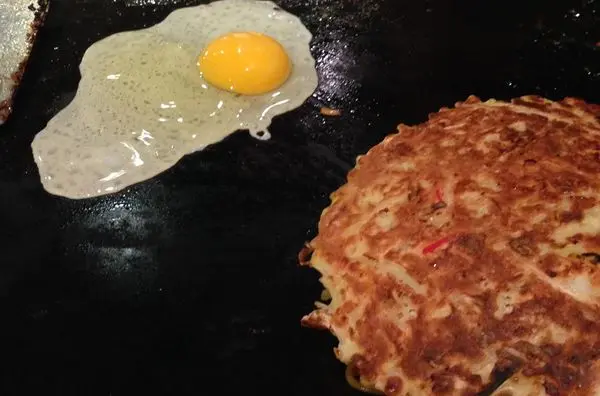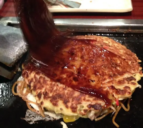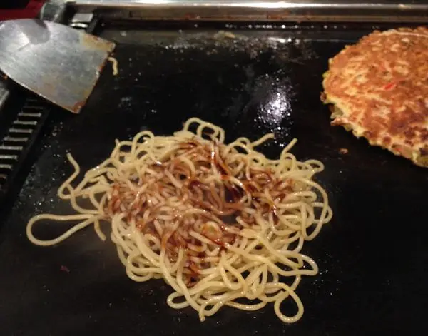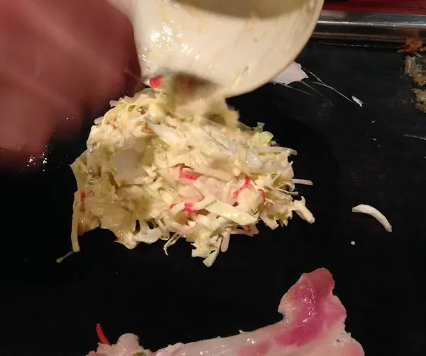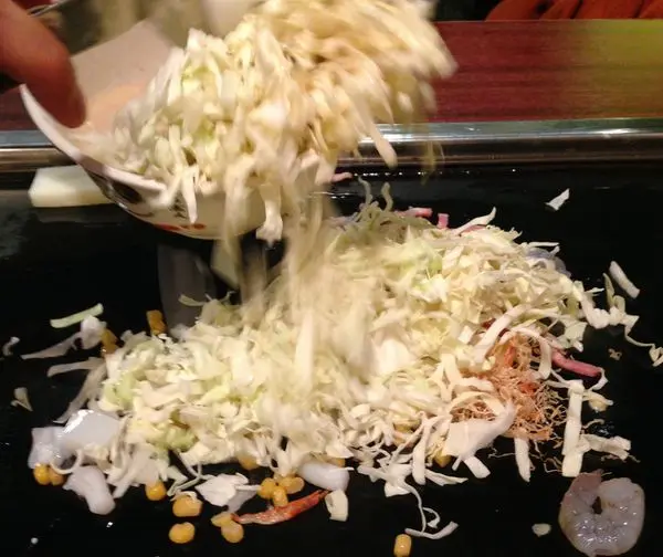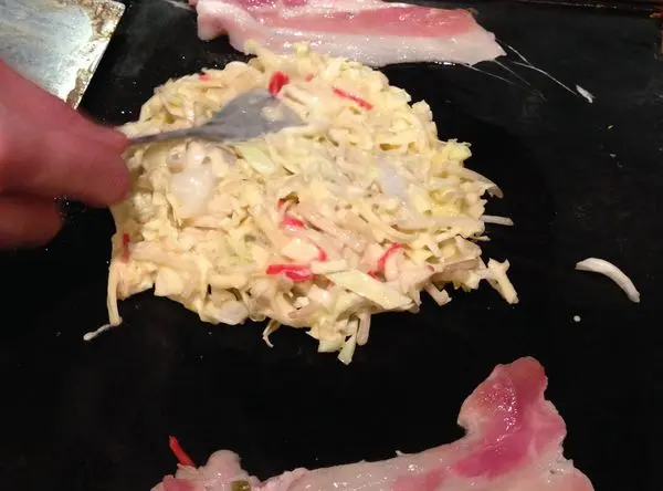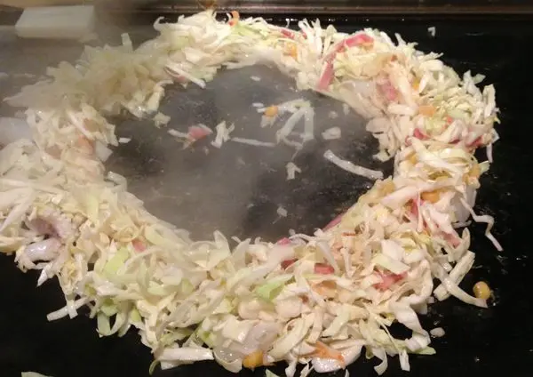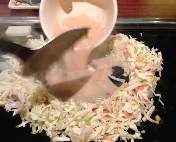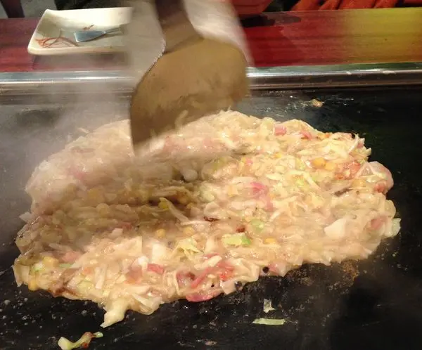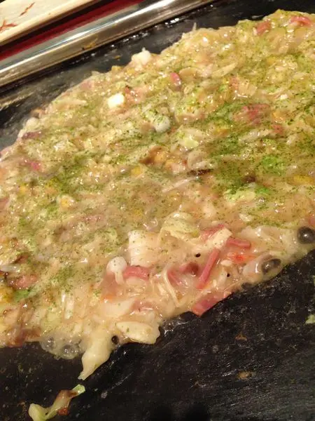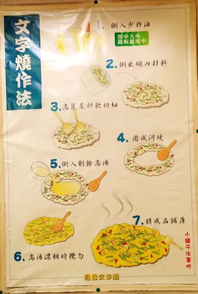 文字燒是屬於東京的巷弄小吃,聽說以前在雜貨店都會有小鐵板區,孩童們下課就會去那邊吃,然後把一些小點類似魷魚絲啊起司絲等東西一起攪進去,所以對他們來說文字燒就像點心一般