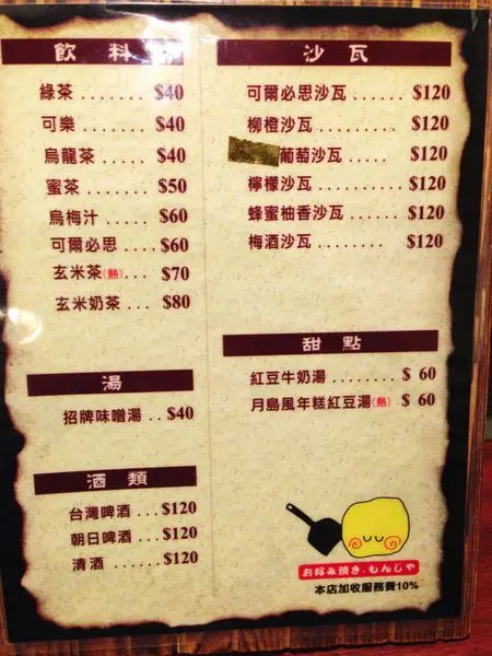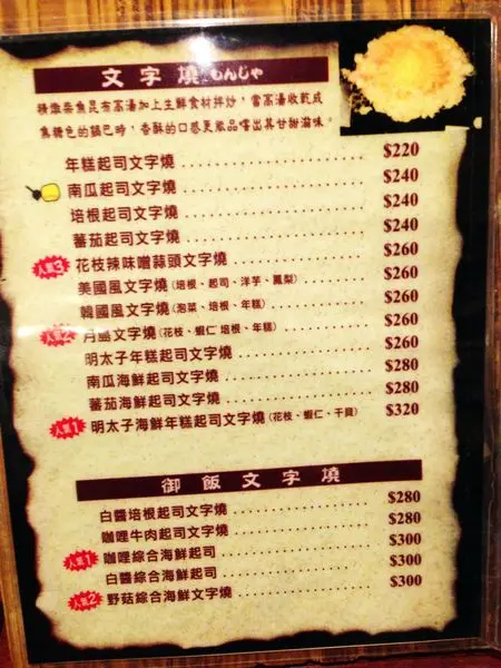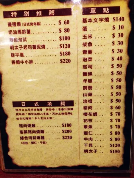 不知道要吃什麼的一天,S跟俐想了又想,吃吃到飽也不是,吃飯吃麵吃東東,想來想去實在不知道要吃什麼,最後竟然來吃了與討論完全不相干的文字燒!話說認識文字燒這件事S我從國中就吃過它了,那時完全沒有覺得這東西有啥特別,直到某次要去日本旅遊時,打算事前找間大阪燒店可以當消夜用的,才認識了文字燒與大阪燒真正的差別。廢話等等再說現來吃飯吧!