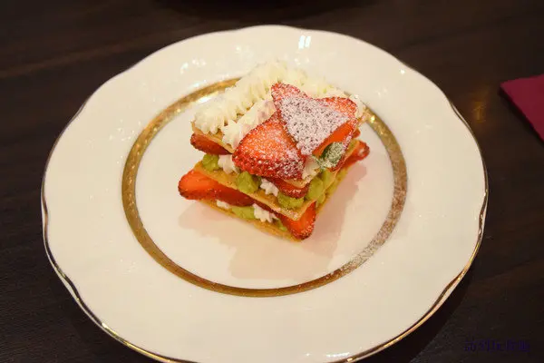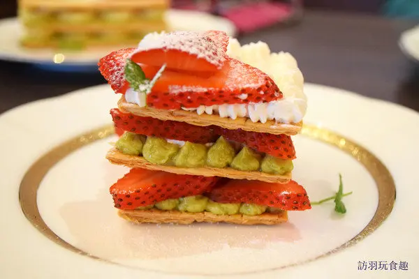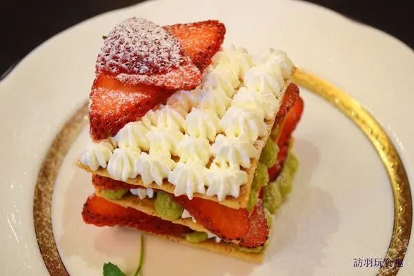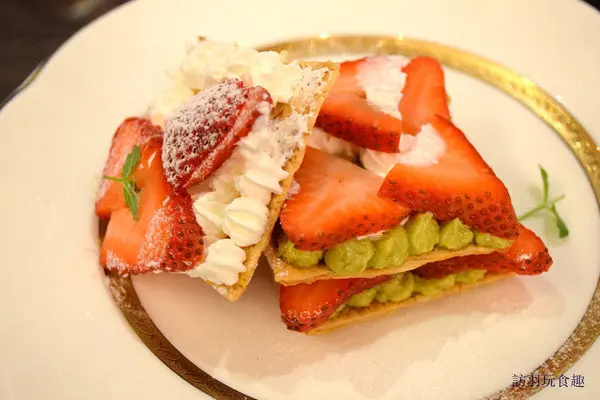 綿滑抹茶卡士達醬香甜不苦搭上微酸草莓很順口