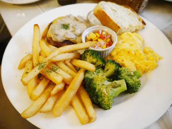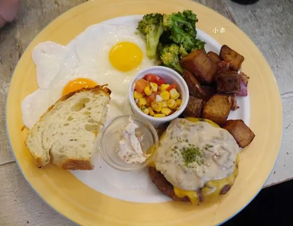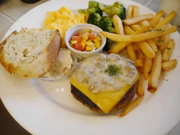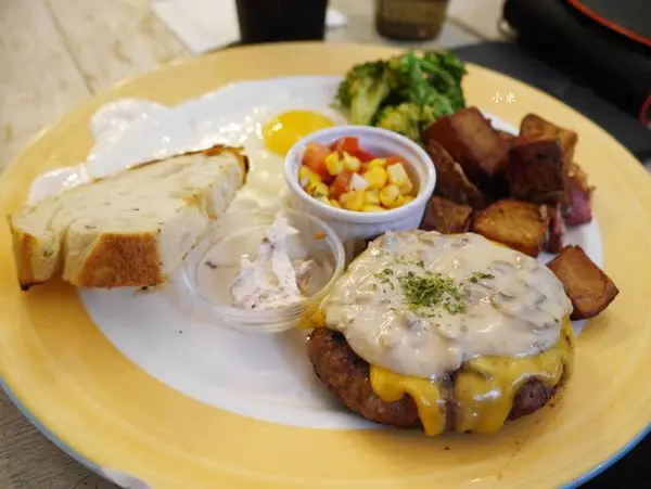 起士漢堡排佐奶油蘑菇醬、歐式麵包、薯塊、花椰菜、太陽蛋、番茄玉米