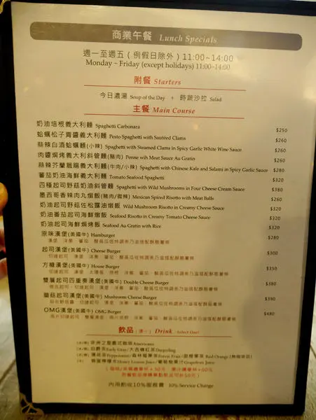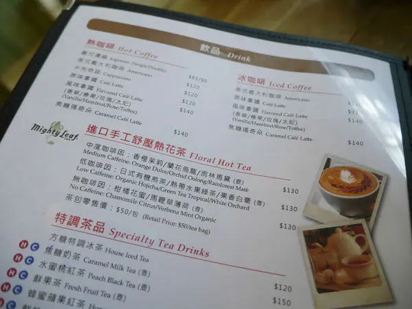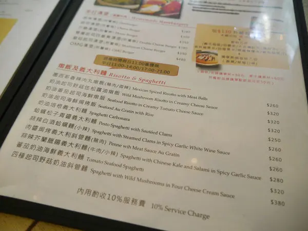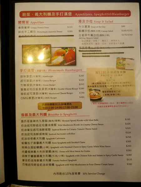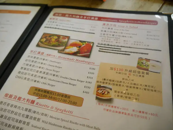 餐點種類很多,開胃菜、手打漢堡、義大利麵、燉飯、全日早午餐、自家烘焙甜點、飲品