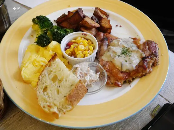 嫩煎雞腿排佐奶油蘑菇醬、歐式麵包、薯塊、花椰菜、炒蛋、番茄玉米