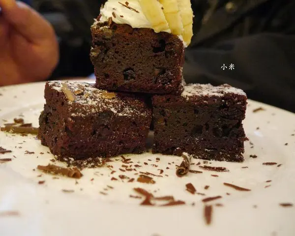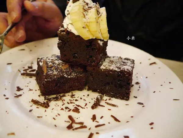 一份裡有三塊微烤熱的布朗尼,以巧克力碎屑與糖粉裝飾,最上方有切片香蕉與鮮奶油