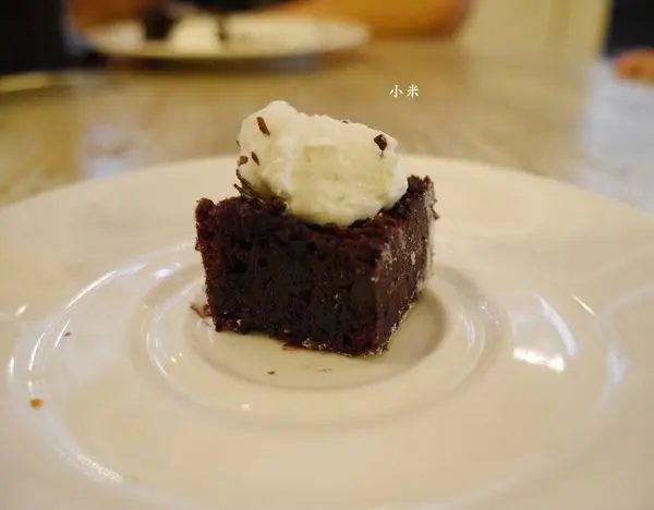 巧克力布朗尼外表烤得微酥脆,微溫的蛋糕體不過於濕潤但也不偏乾